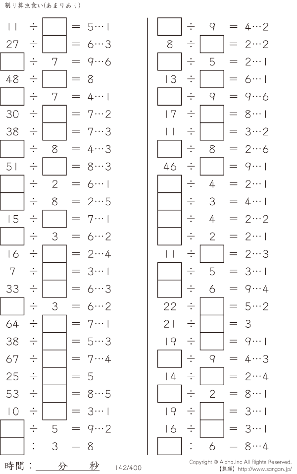 上記のボタンから「虫食い・割り算・あまりあり」の算数数学ドリル・計算ドリル(PDFプリント)がダウンロードできます。個人利用は無料です(家庭以外での配布は有料です)。
