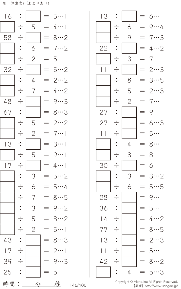 上記のボタンから「虫食い・割り算・あまりあり」の算数数学ドリル・計算ドリル(PDFプリント)がダウンロードできます。個人利用は無料です(家庭以外での配布は有料です)。