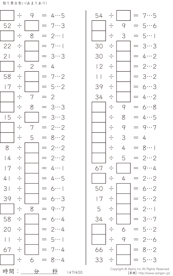 上記のボタンから「虫食い・割り算・あまりあり」の算数数学ドリル・計算ドリル(PDFプリント)がダウンロードできます。個人利用は無料です(家庭以外での配布は有料です)。