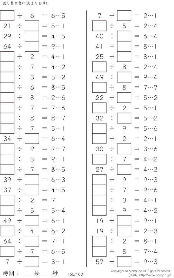上記のボタンから「虫食い・割り算・あまりあり」の算数数学ドリル・計算ドリル(PDFプリント)がダウンロードできます。個人利用は無料です(家庭以外での配布は有料です)。
