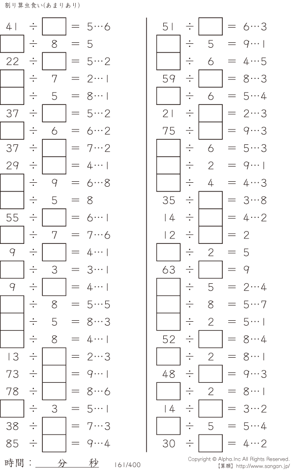 上記のボタンから「虫食い・割り算・あまりあり」の算数数学ドリル・計算ドリル(PDFプリント)がダウンロードできます。個人利用は無料です(家庭以外での配布は有料です)。