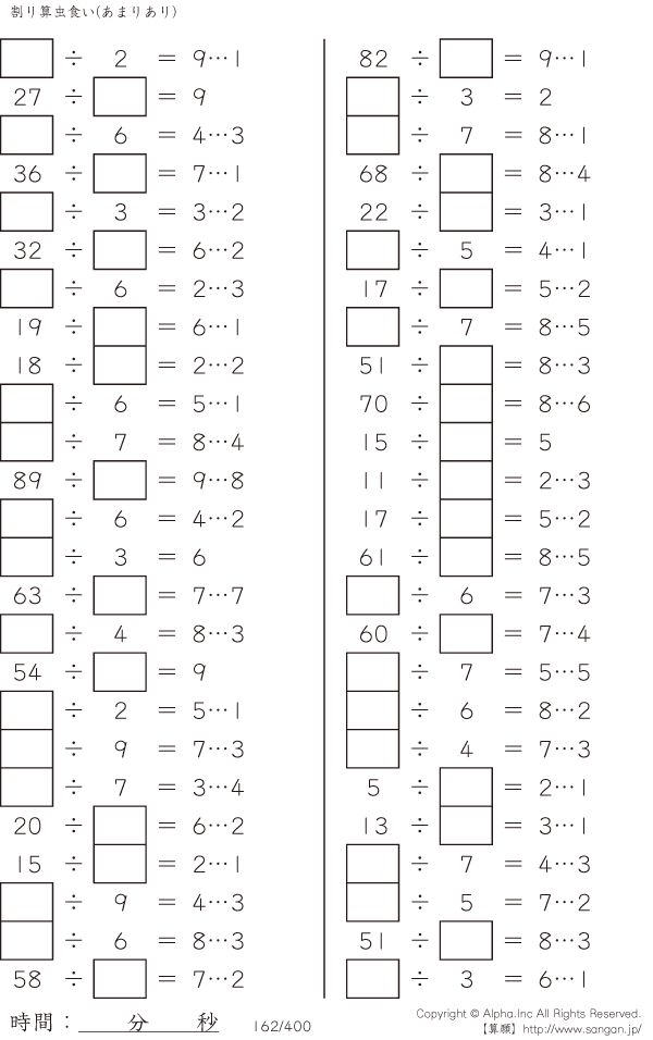 上記のボタンから「虫食い・割り算・あまりあり」の算数数学ドリル・計算ドリル(PDFプリント)がダウンロードできます。個人利用は無料です(家庭以外での配布は有料です)。