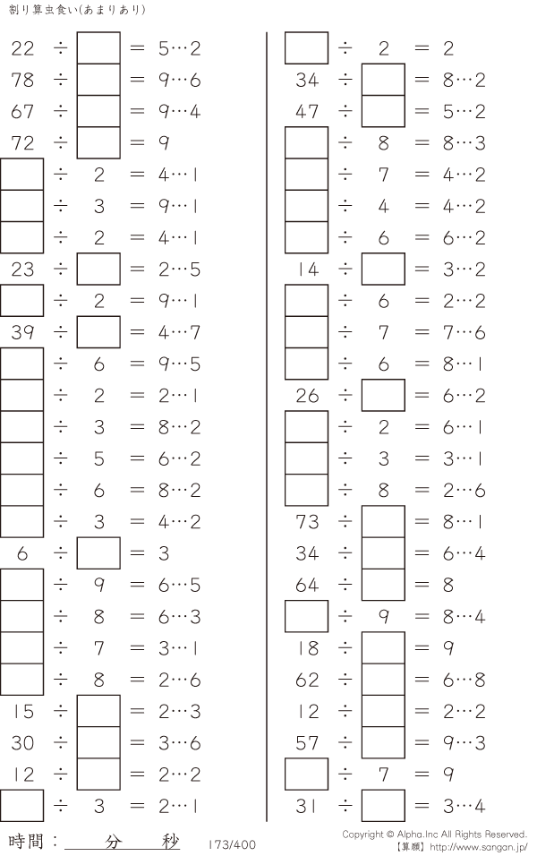 上記のボタンから「虫食い・割り算・あまりあり」の算数数学ドリル・計算ドリル(PDFプリント)がダウンロードできます。個人利用は無料です(家庭以外での配布は有料です)。