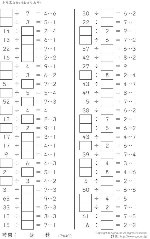 上記のボタンから「虫食い・割り算・あまりあり」の算数数学ドリル・計算ドリル(PDFプリント)がダウンロードできます。個人利用は無料です(家庭以外での配布は有料です)。