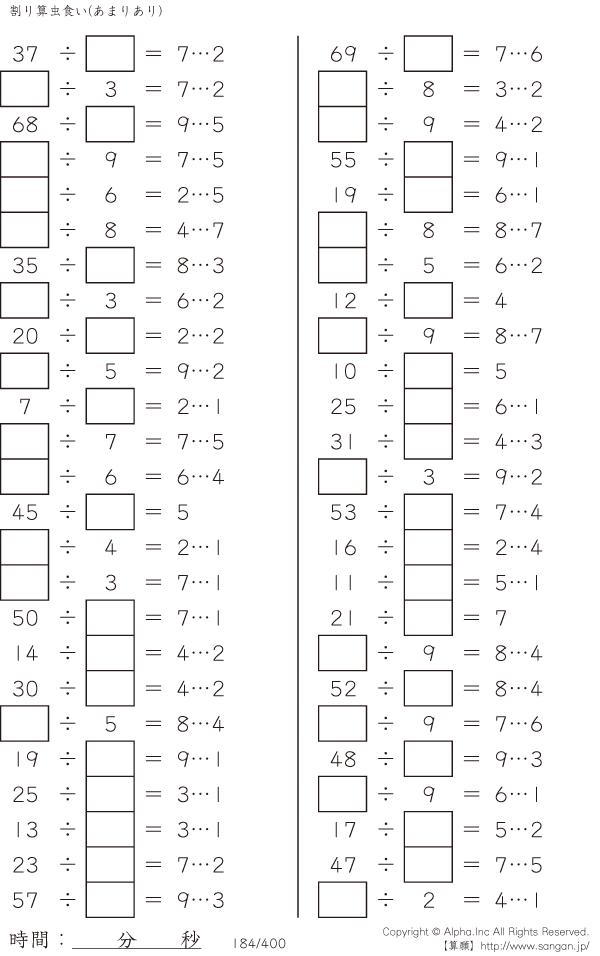 上記のボタンから「虫食い・割り算・あまりあり」の算数数学ドリル・計算ドリル(PDFプリント)がダウンロードできます。個人利用は無料です(家庭以外での配布は有料です)。