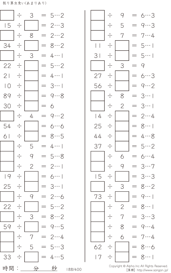 上記のボタンから「虫食い・割り算・あまりあり」の算数数学ドリル・計算ドリル(PDFプリント)がダウンロードできます。個人利用は無料です(家庭以外での配布は有料です)。