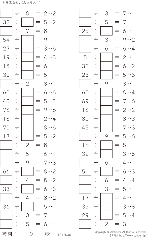 上記のボタンから「虫食い・割り算・あまりあり」の算数数学ドリル・計算ドリル(PDFプリント)がダウンロードできます。個人利用は無料です(家庭以外での配布は有料です)。