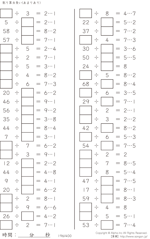 上記のボタンから「虫食い・割り算・あまりあり」の算数数学ドリル・計算ドリル(PDFプリント)がダウンロードできます。個人利用は無料です(家庭以外での配布は有料です)。