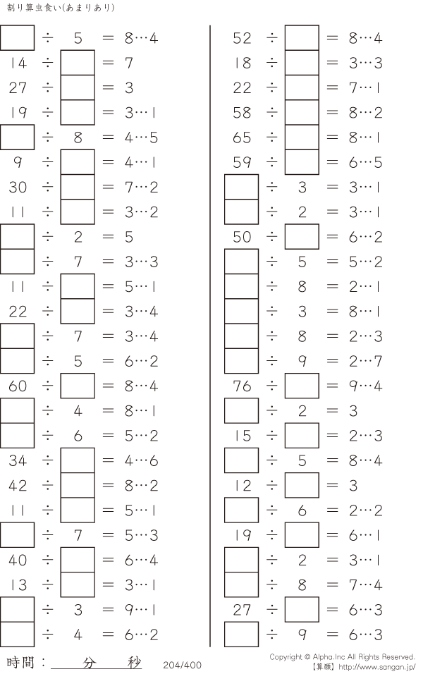 上記のボタンから「虫食い・割り算・あまりあり」の算数数学ドリル・計算ドリル(PDFプリント)がダウンロードできます。個人利用は無料です(家庭以外での配布は有料です)。