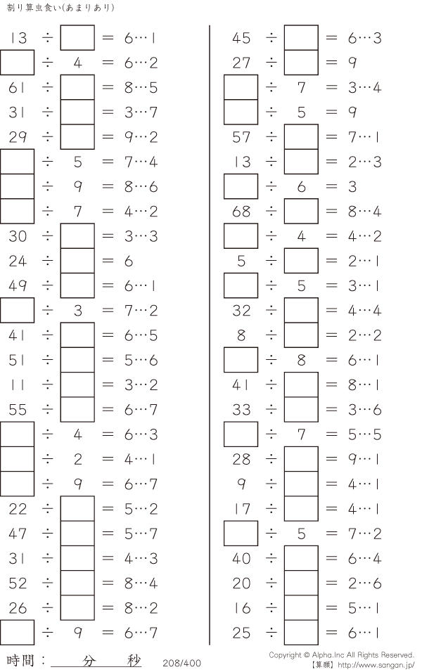 上記のボタンから「虫食い・割り算・あまりあり」の算数数学ドリル・計算ドリル(PDFプリント)がダウンロードできます。個人利用は無料です(家庭以外での配布は有料です)。