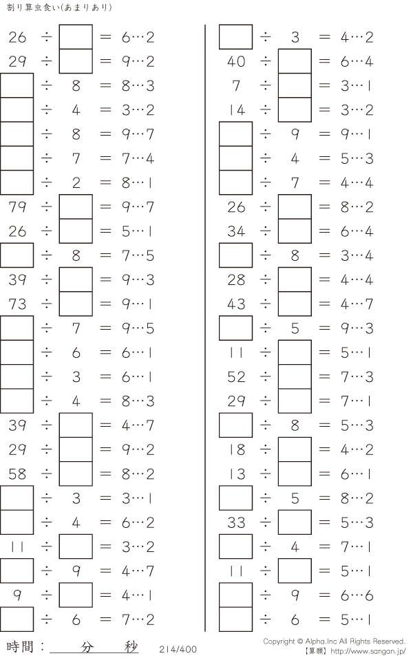 上記のボタンから「虫食い・割り算・あまりあり」の算数数学ドリル・計算ドリル(PDFプリント)がダウンロードできます。個人利用は無料です(家庭以外での配布は有料です)。