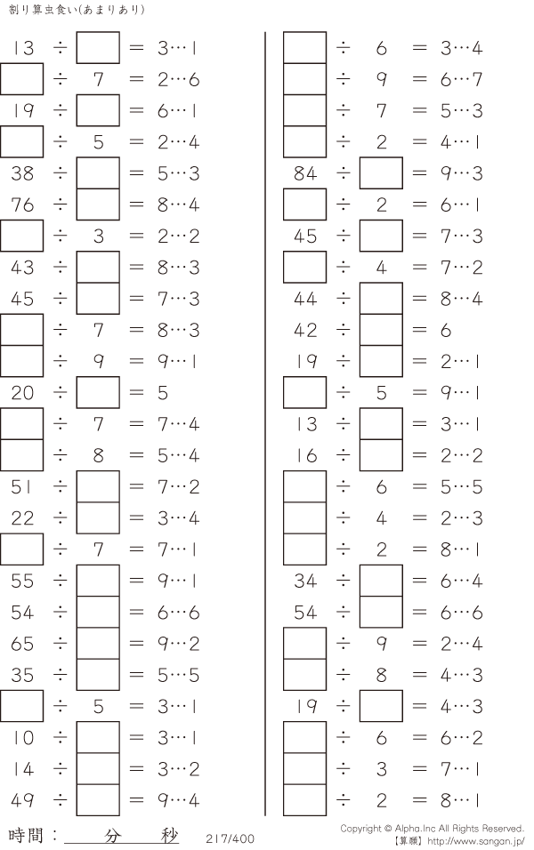 上記のボタンから「虫食い・割り算・あまりあり」の算数数学ドリル・計算ドリル(PDFプリント)がダウンロードできます。個人利用は無料です(家庭以外での配布は有料です)。