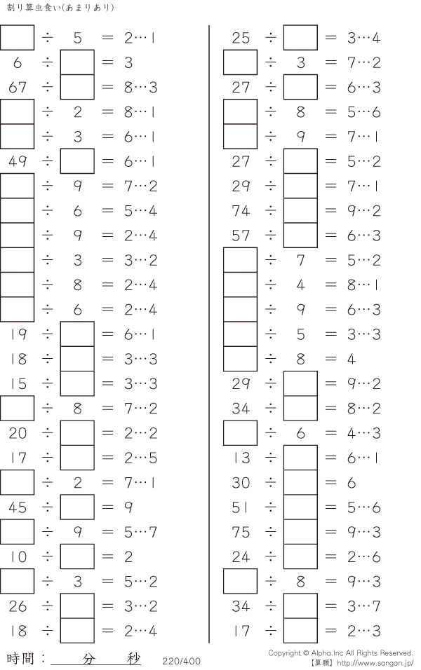 上記のボタンから「虫食い・割り算・あまりあり」の算数数学ドリル・計算ドリル(PDFプリント)がダウンロードできます。個人利用は無料です(家庭以外での配布は有料です)。
