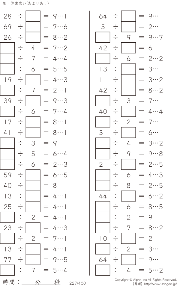 上記のボタンから「虫食い・割り算・あまりあり」の算数数学ドリル・計算ドリル(PDFプリント)がダウンロードできます。個人利用は無料です(家庭以外での配布は有料です)。