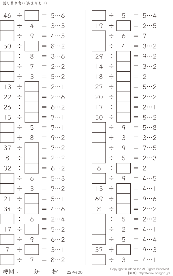 上記のボタンから「虫食い・割り算・あまりあり」の算数数学ドリル・計算ドリル(PDFプリント)がダウンロードできます。個人利用は無料です(家庭以外での配布は有料です)。