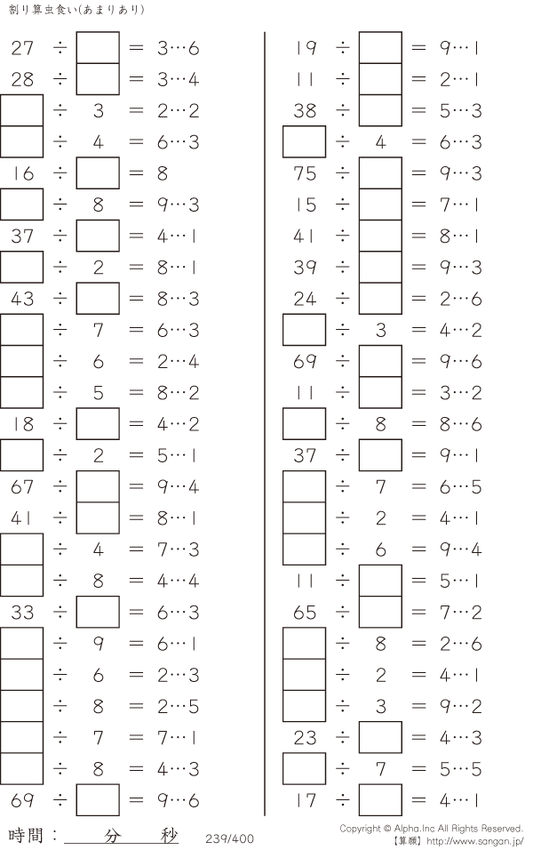 上記のボタンから「虫食い・割り算・あまりあり」の算数数学ドリル・計算ドリル(PDFプリント)がダウンロードできます。個人利用は無料です(家庭以外での配布は有料です)。