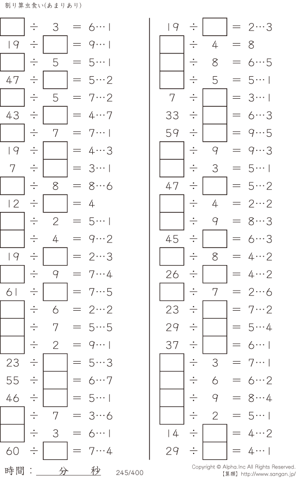 上記のボタンから「虫食い・割り算・あまりあり」の算数数学ドリル・計算ドリル(PDFプリント)がダウンロードできます。個人利用は無料です(家庭以外での配布は有料です)。