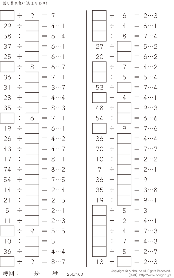 上記のボタンから「虫食い・割り算・あまりあり」の算数数学ドリル・計算ドリル(PDFプリント)がダウンロードできます。個人利用は無料です(家庭以外での配布は有料です)。
