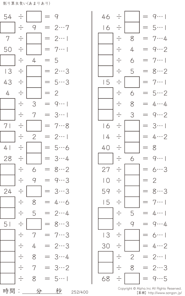上記のボタンから「虫食い・割り算・あまりあり」の算数数学ドリル・計算ドリル(PDFプリント)がダウンロードできます。個人利用は無料です(家庭以外での配布は有料です)。