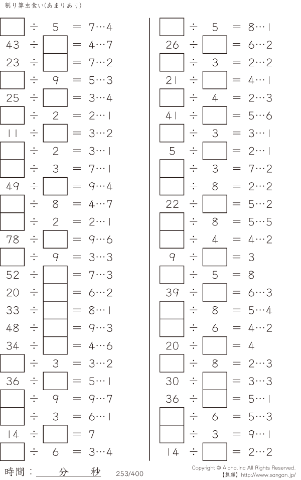 上記のボタンから「虫食い・割り算・あまりあり」の算数数学ドリル・計算ドリル(PDFプリント)がダウンロードできます。個人利用は無料です(家庭以外での配布は有料です)。