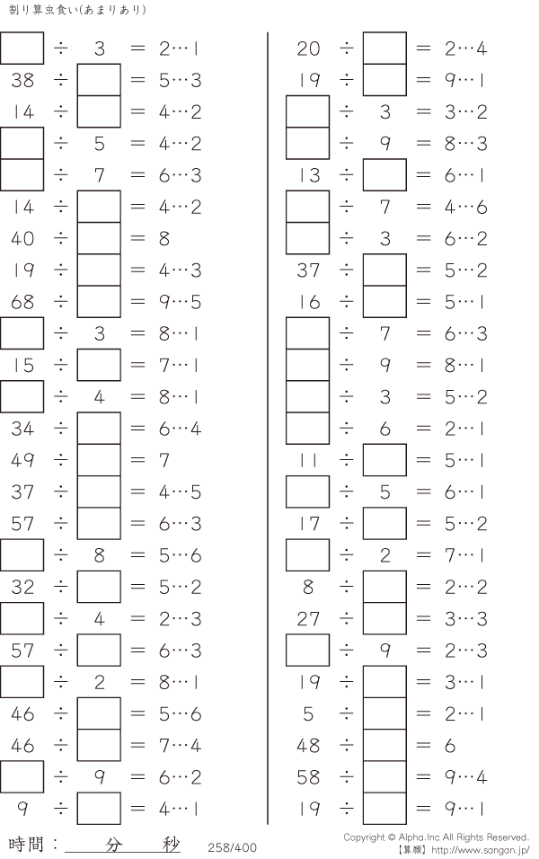 上記のボタンから「虫食い・割り算・あまりあり」の算数数学ドリル・計算ドリル(PDFプリント)がダウンロードできます。個人利用は無料です(家庭以外での配布は有料です)。