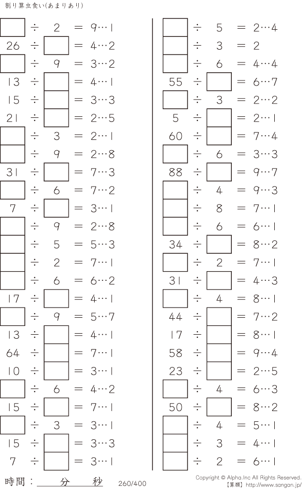 上記のボタンから「虫食い・割り算・あまりあり」の算数数学ドリル・計算ドリル(PDFプリント)がダウンロードできます。個人利用は無料です(家庭以外での配布は有料です)。