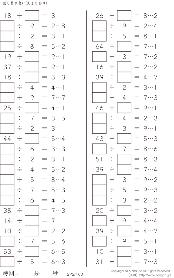 上記のボタンから「虫食い・割り算・あまりあり」の算数数学ドリル・計算ドリル(PDFプリント)がダウンロードできます。個人利用は無料です(家庭以外での配布は有料です)。
