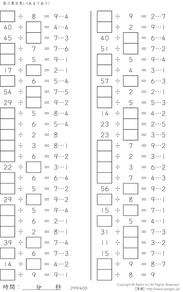 上記のボタンから「虫食い・割り算・あまりあり」の算数数学ドリル・計算ドリル(PDFプリント)がダウンロードできます。個人利用は無料です(家庭以外での配布は有料です)。