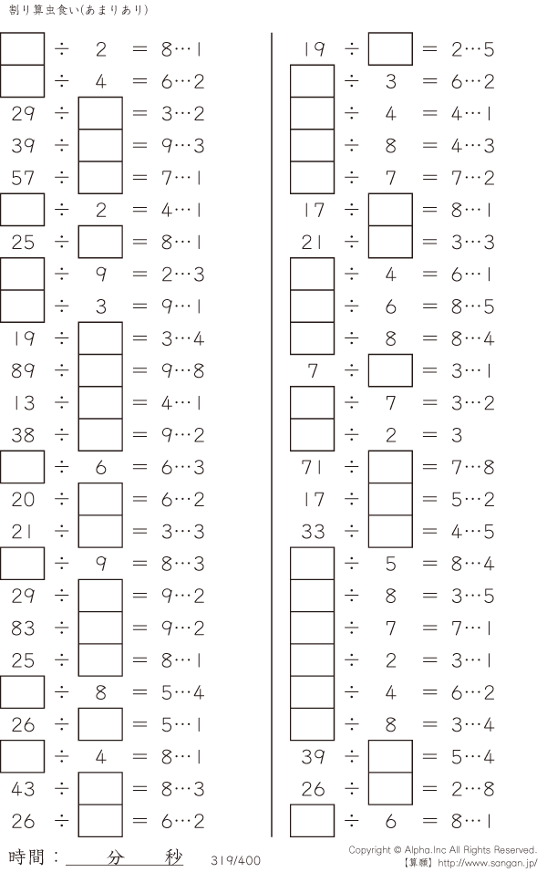 上記のボタンから「虫食い・割り算・あまりあり」の算数数学ドリル・計算ドリル(PDFプリント)がダウンロードできます。個人利用は無料です(家庭以外での配布は有料です)。