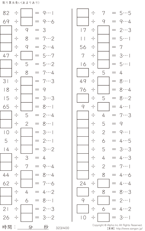 上記のボタンから「虫食い・割り算・あまりあり」の算数数学ドリル・計算ドリル(PDFプリント)がダウンロードできます。個人利用は無料です(家庭以外での配布は有料です)。