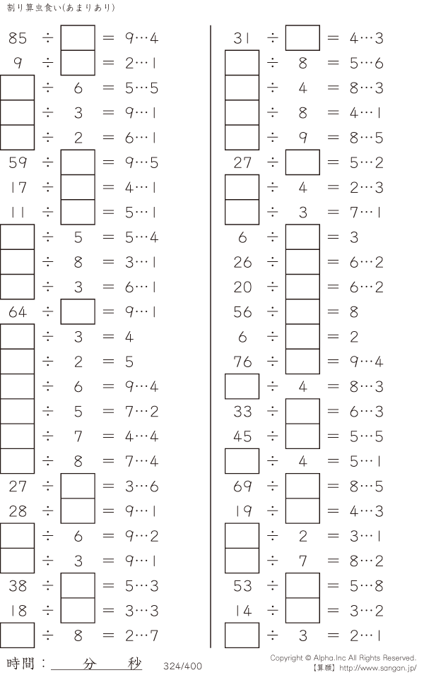 上記のボタンから「虫食い・割り算・あまりあり」の算数数学ドリル・計算ドリル(PDFプリント)がダウンロードできます。個人利用は無料です(家庭以外での配布は有料です)。