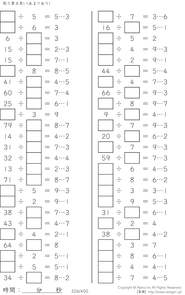 上記のボタンから「虫食い・割り算・あまりあり」の算数数学ドリル・計算ドリル(PDFプリント)がダウンロードできます。個人利用は無料です(家庭以外での配布は有料です)。