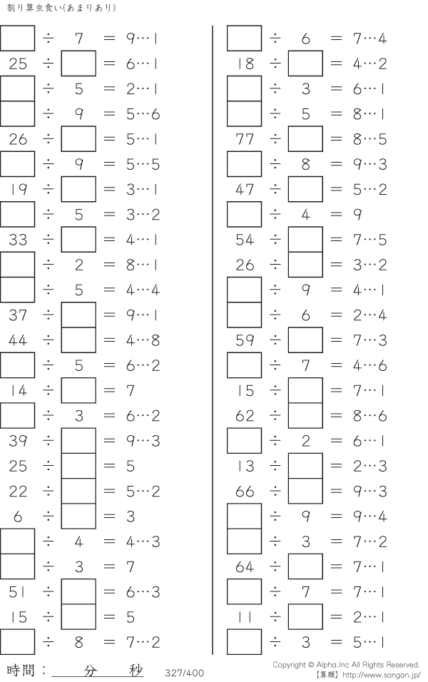 上記のボタンから「虫食い・割り算・あまりあり」の算数数学ドリル・計算ドリル(PDFプリント)がダウンロードできます。個人利用は無料です(家庭以外での配布は有料です)。