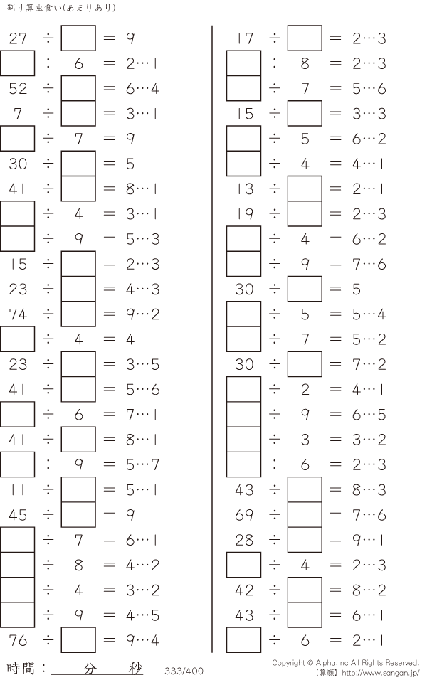 上記のボタンから「虫食い・割り算・あまりあり」の算数数学ドリル・計算ドリル(PDFプリント)がダウンロードできます。個人利用は無料です(家庭以外での配布は有料です)。