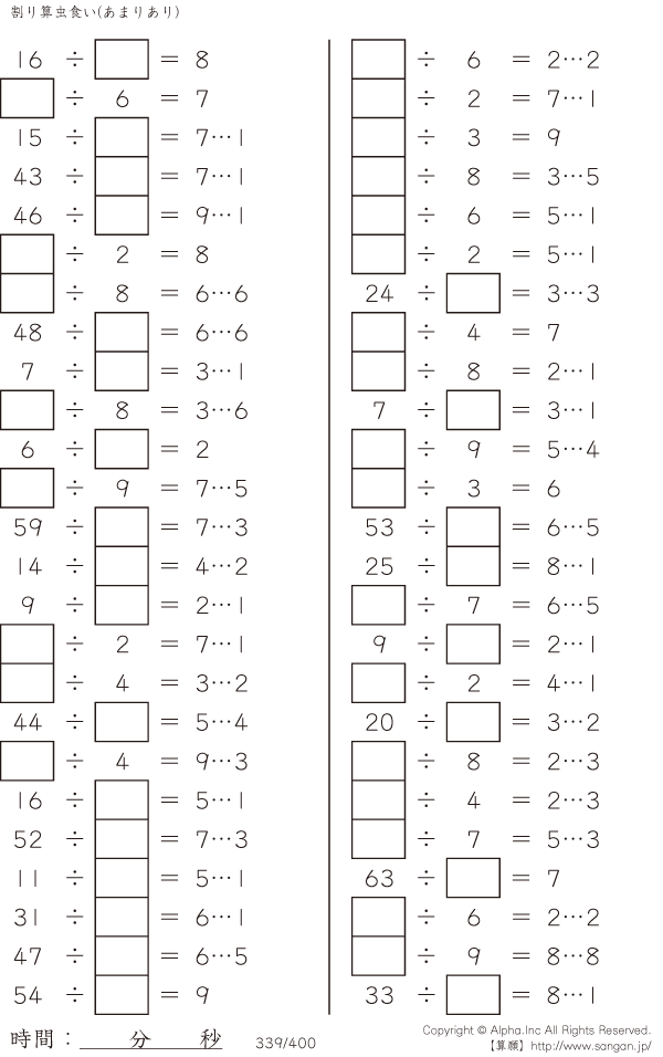 上記のボタンから「虫食い・割り算・あまりあり」の算数数学ドリル・計算ドリル(PDFプリント)がダウンロードできます。個人利用は無料です(家庭以外での配布は有料です)。