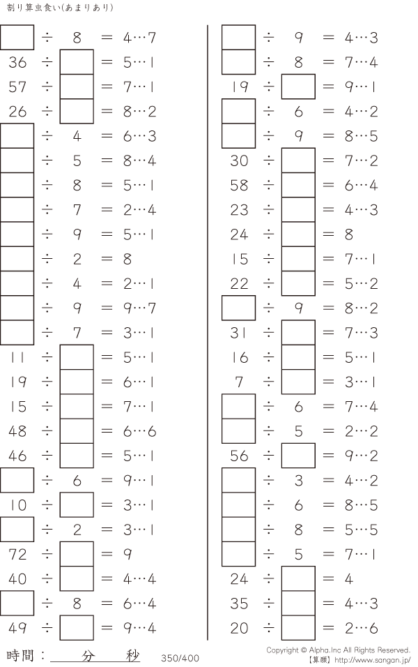 上記のボタンから「虫食い・割り算・あまりあり」の算数数学ドリル・計算ドリル(PDFプリント)がダウンロードできます。個人利用は無料です(家庭以外での配布は有料です)。