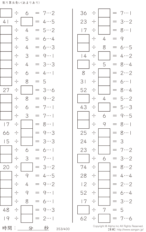 上記のボタンから「虫食い・割り算・あまりあり」の算数数学ドリル・計算ドリル(PDFプリント)がダウンロードできます。個人利用は無料です(家庭以外での配布は有料です)。