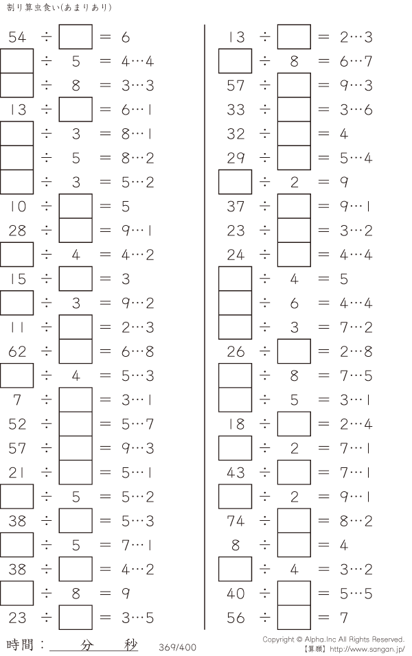 上記のボタンから「虫食い・割り算・あまりあり」の算数数学ドリル・計算ドリル(PDFプリント)がダウンロードできます。個人利用は無料です(家庭以外での配布は有料です)。