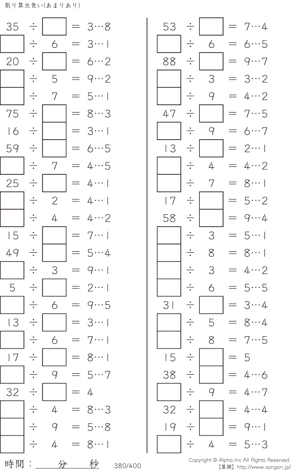 上記のボタンから「虫食い・割り算・あまりあり」の算数数学ドリル・計算ドリル(PDFプリント)がダウンロードできます。個人利用は無料です(家庭以外での配布は有料です)。