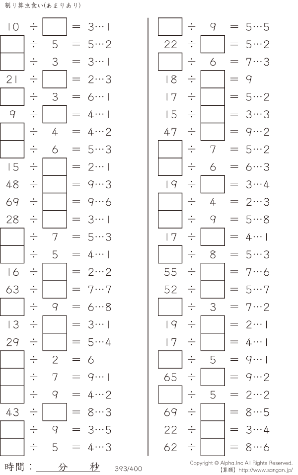 上記のボタンから「虫食い・割り算・あまりあり」の算数数学ドリル・計算ドリル(PDFプリント)がダウンロードできます。個人利用は無料です(家庭以外での配布は有料です)。