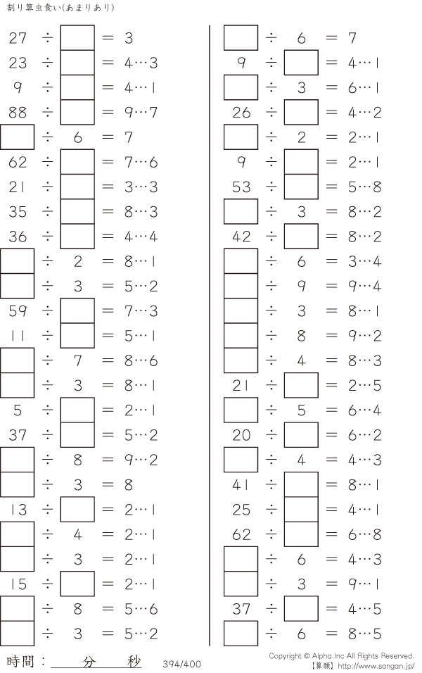 上記のボタンから「虫食い・割り算・あまりあり」の算数数学ドリル・計算ドリル(PDFプリント)がダウンロードできます。個人利用は無料です(家庭以外での配布は有料です)。