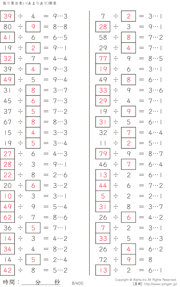 上記のボタンから「虫食い・割り算・あまりあり」の算数数学ドリル・計算ドリル(PDFプリント)がダウンロードできます。個人利用は無料です(家庭以外での配布は有料です)。