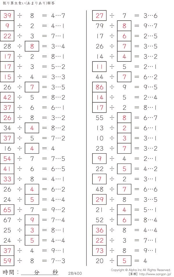 上記のボタンから「虫食い・割り算・あまりあり」の算数数学ドリル・計算ドリル(PDFプリント)がダウンロードできます。個人利用は無料です(家庭以外での配布は有料です)。