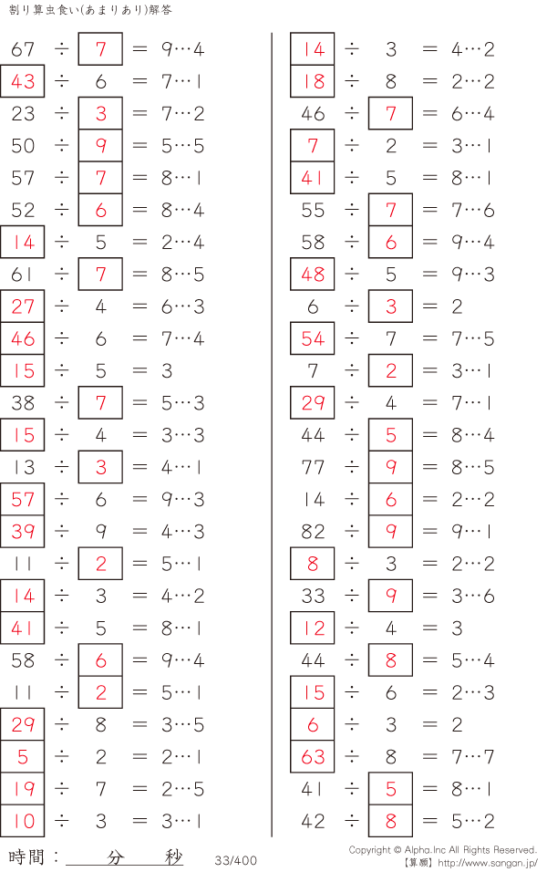 上記のボタンから「虫食い・割り算・あまりあり」の算数数学ドリル・計算ドリル(PDFプリント)がダウンロードできます。個人利用は無料です(家庭以外での配布は有料です)。