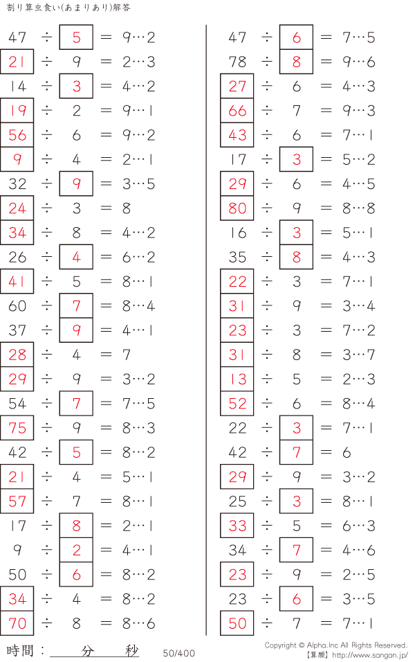 上記のボタンから「虫食い・割り算・あまりあり」の算数数学ドリル・計算ドリル(PDFプリント)がダウンロードできます。個人利用は無料です(家庭以外での配布は有料です)。