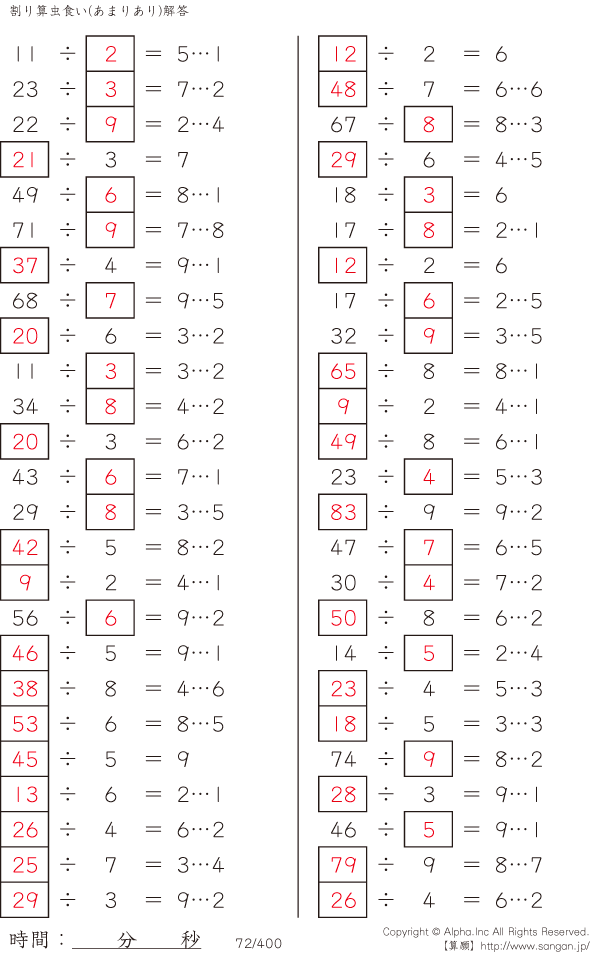 上記のボタンから「虫食い・割り算・あまりあり」の算数数学ドリル・計算ドリル(PDFプリント)がダウンロードできます。個人利用は無料です(家庭以外での配布は有料です)。