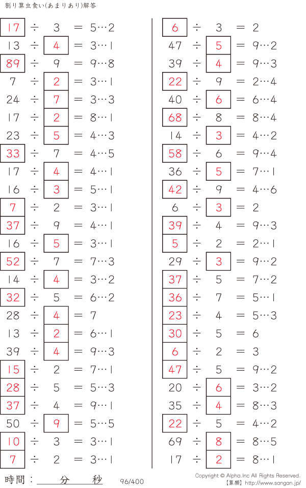上記のボタンから「虫食い・割り算・あまりあり」の算数数学ドリル・計算ドリル(PDFプリント)がダウンロードできます。個人利用は無料です(家庭以外での配布は有料です)。