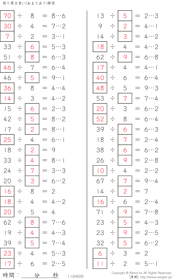 上記のボタンから「虫食い・割り算・あまりあり」の算数数学ドリル・計算ドリル(PDFプリント)がダウンロードできます。個人利用は無料です(家庭以外での配布は有料です)。