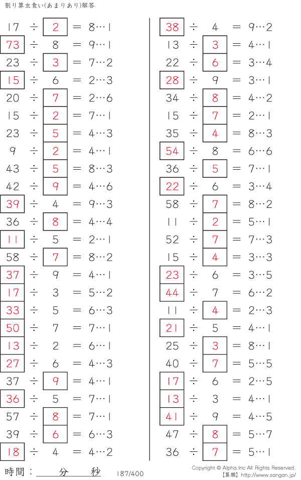 上記のボタンから「虫食い・割り算・あまりあり」の算数数学ドリル・計算ドリル(PDFプリント)がダウンロードできます。個人利用は無料です(家庭以外での配布は有料です)。