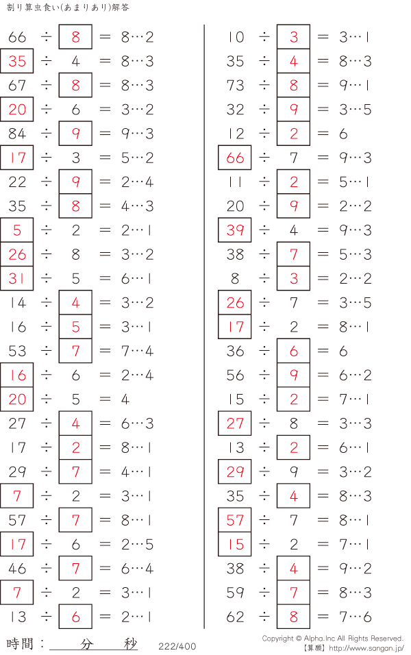 上記のボタンから「虫食い・割り算・あまりあり」の算数数学ドリル・計算ドリル(PDFプリント)がダウンロードできます。個人利用は無料です(家庭以外での配布は有料です)。
